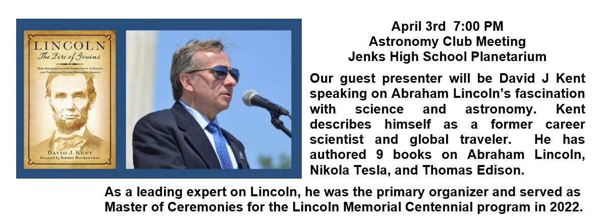 --Bringing Stars to the Eyes of Tulsa since 1937--About UsWe are an all volunteer, non-profit and tax exempt 501c3 organization, actively serving the astronomy community in the Tulsa and surrounding area communities for almost 90 years. More about our club:We also own and operate our own observatory SW of Tulsa near Mounds, OK. Read more here: We also publish monthly newsletters available here: March 2026 Newsletter. Look of our Newsletter Archive under the ABOUT TAB Follow us on Facebook and Instagram to find more astronomy related posts shared from other sources, plus any special announcements. During the school term we have monthly club meetings at the Jenks High School Planetarium. See our events section below for the latest meeting schedule and agenda. A downloadable/printable club brochure may be found at this link: BROCHURE Our Club Events The Astronomy Club of Tulsa and its members would like to invite you to the darker skies at our observatory or one of our other scheduled public outreach events. You don't need a telescope or binoculars, just let us know you are coming and look through our telescopes. We also schedule public events in our local communities such as Hunter Park in Tulsa, Case Community Center in Sand Springs, and the Keystone Ancient Forest near Keystone Lake. More details are available on our EVENTS PAGE. Our Next Astronomy Club Meeting - April 3rd @ 7:00 PM Members and Guests are invited to our next monthly club meeting of 2026.