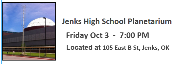 Jenks Planetarium is Located at 105 East B St, Jenks, OK Our October Guest Speaker is Mike Grogan - Fox 23 Meteorologist Special Events