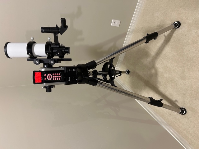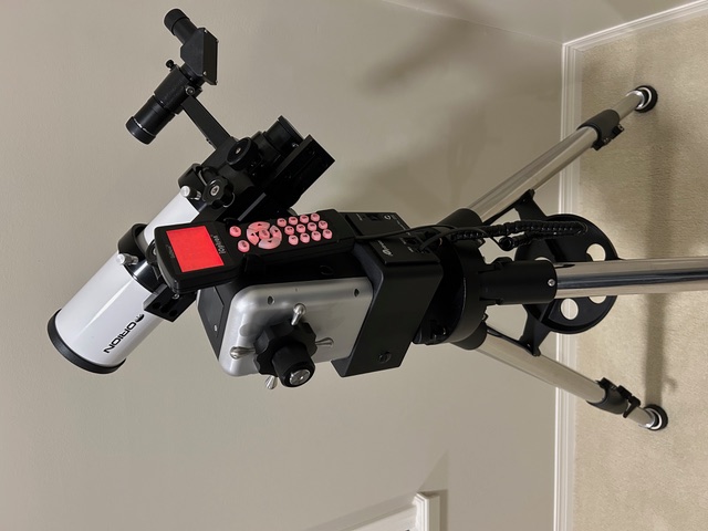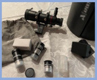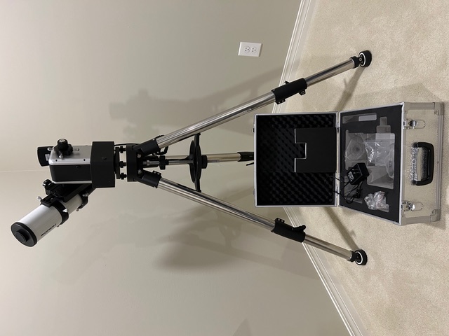 EXTRAS: Carrying case, magnetic counterweight, dew/light shield, Svbony finder scope - 8x50, 25mm & 10mm eyepieces (1.25") and Orion "Shorty" Barlow, collimation cap. Base has been upgraded with an eyepiece rack and Apertura roller bearing kit for smoother operation.